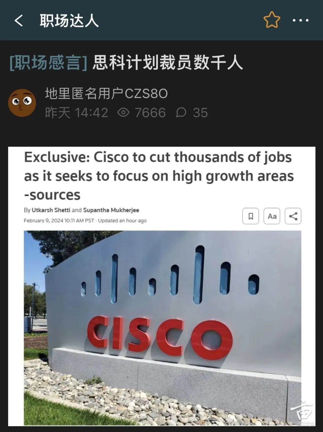 思科老员工在此。去年底blind上就在传了,听说这次裁会的比较狠,至少5k以上,有人说会达到8k,具体2/14 财报时会公布。不过我司年年裁,市场好别的大厂都扩张的时候我们也还是在裁。一年一裁,半年一reorg,可谓是老生常裁了🐶。