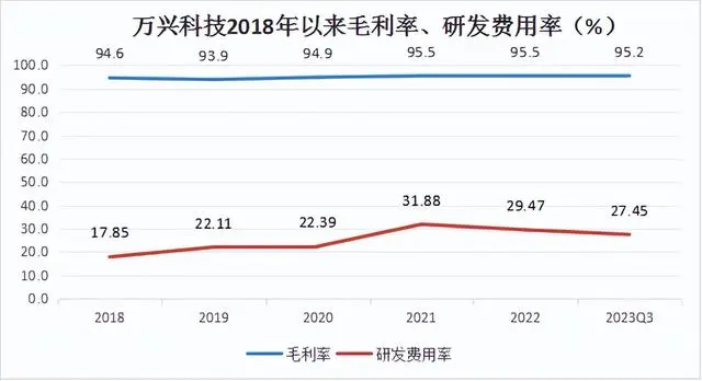 2018年至今,公司综合毛利率稳定在95%左右,属于竞争优势明显的轻资产公司。也正是为了保持行业竞争优势,公司近年来持续保持高研发投入,2023前三季度研发费用为3.0亿元,研发费用率为 27.45%。