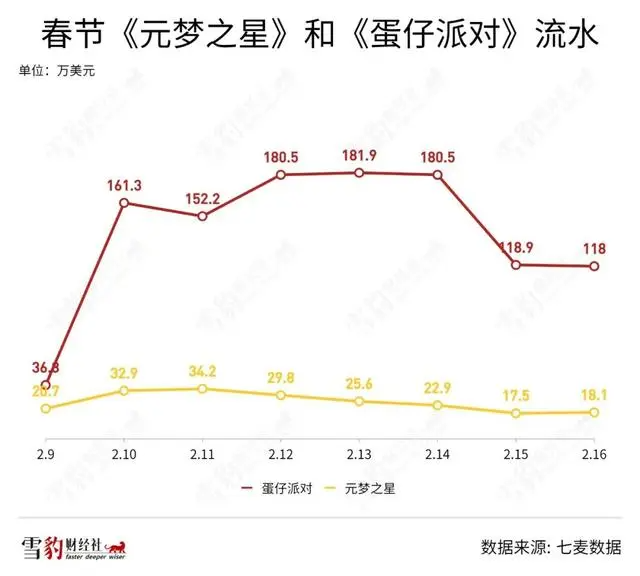 据七麦数据,2月9日至2月16日(除夕至大年初七),《元梦之星》iOS端收入为202万美元,《蛋仔派对》为1130万美元。而在春节前,双方流水一度咬得很紧。
