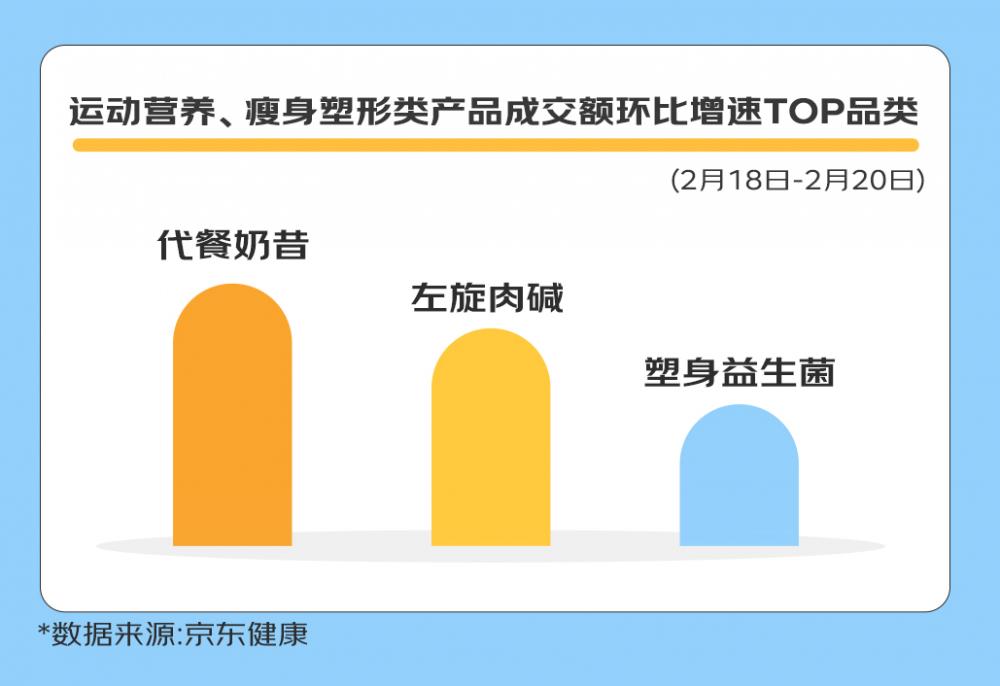 另一方面,消费者健康意识显著提升,减重不在盲目,更多人选择科学制定健康管理解决方案。开工三天,运动营养类、瘦身塑形类产品的整体成交额增速明显。京东健康代餐奶昔品类成交额环比上月增长193%;左旋肉碱品类成交额环比上月增长162%;塑身益生菌品类成交额环比上月增长141%。