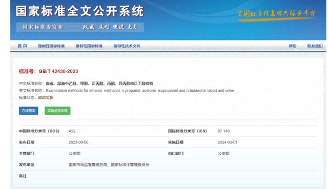 国家标准《血液、尿液中乙醇、甲醇、正丙醇、丙酮、异丙醇和正丁醇检验》(GB/T 42430-2023),于2024年3月1日起实施。新检验标准以血液中乙醇的含量检验为例:饮酒驾驶为0.20mg/mL,驾驶员血液中乙醇含量大于或等于0.80mg/mL属于醉驾。检验线性范围为0.1mg/mL~3mg/mL。该国家标准可适用于五种醇类物质及丙酮的中毒、死亡检验、医疗急救检验、科学研究等其他更为广泛的场景。
