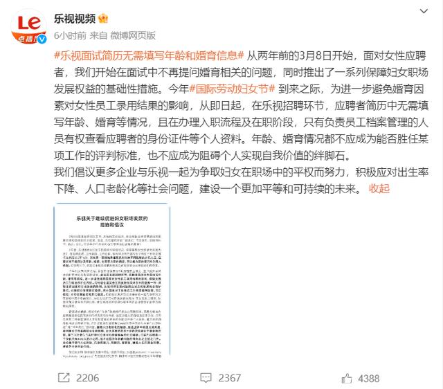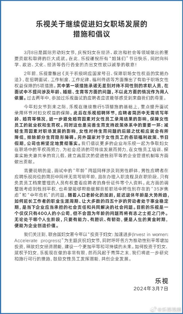 乐视视频官方写道:从两年前的3月8日开始,面对女性应聘者,我们开始在面试中不再提问婚育相关的问题,同时推出了一系列保障妇女职场发展权益的基础性措施。今年国际劳动妇女节到来之际,为进一步避免婚育因素对女性员工录用结果的影响,从即日起,在乐视招聘环节,应聘者简历中无需填写年龄、婚育等情况,且在办理入职流程及在职阶段,只有负责员工档案管理的人员有权查看应聘者的身份证件等个人资料。年龄、婚育情况都不应成为能否胜任某项工作的评判标准,也不应成为阻碍个人实现自我价值的绊脚石。