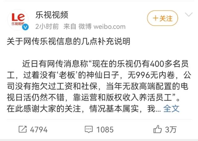 2022年7月,有网传消息称“现在的乐视仍有400多名员工,过着没有老板的神仙日子,无996无内卷,公司没有拖欠过工资和社保,当年无敌高端配置的电视日活仍然不错,靠运营和版权收入养活员工”。
