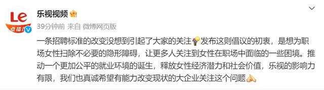 随后,乐视视频又在微博发文称,一条招聘标准的改变没想到引起了大家的关注,发布这则倡议的初衷,是想为职场女性扫除不必要的隐形障碍,让更多人关注到女性在职场中面临的一些困境。推动一个更加公平的就业环境的诞生,释放女性经济潜力和社会价值,乐视的影响力有限,我们也真诚希望有能力改变现状的大企业关注这个问题。