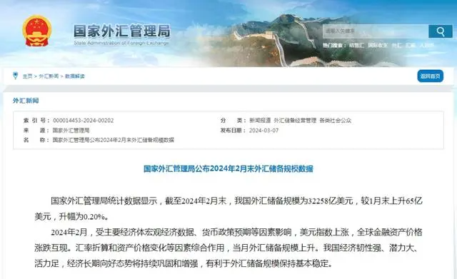 导读:国家外汇管理局7日发布数据显示,截至2024年2月末,我国外汇储备规模为32258亿美元,较1月末上升65亿美元,升幅为0.20%。