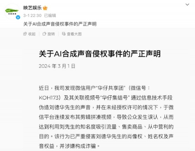 3月1日,刘德华电影公司@映艺娱乐发布严正声明,提醒大家警惕AI语音合成骗局,引发广泛关注。