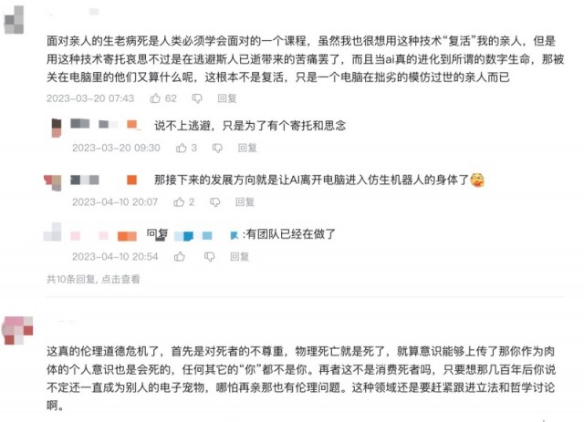 在中国人的传统观念中,这样的视频似乎是对逝者的消费。有网友在评论区留言,“这真的伦理道德危机了,首先是对死者的不尊重,物理死亡就是死了,就算意识能够上传了那你作为肉体的个人意识也是会死的,任何其它的‘你’都不是你。再者这不是消费死者吗,只要想那几百年后你说不定还一直成为别人的电子宠物,哪怕再亲那也有伦理问题。这种领域还是要赶紧跟进立法和哲学讨论啊。”