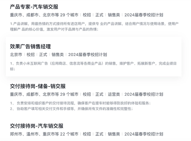 新消费日报记者在小米官网了解到,小米开放了两个有关汽车业务岗位的招聘,一个名为产品专家,另外一个名为交付接待岗,分配为销售类岗位和运营类岗位,属于2024届春季校招计划的一部分,涉及全国各大城市,尤其是一二线城市。