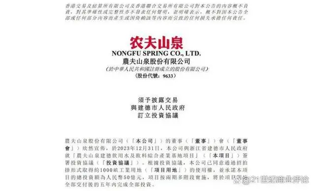去年最后一天,他与浙江省建德市签署50亿元投资项目协议,计划拿地1000亩,建设农夫山泉“饮用水及饮料综合产业基地”,项目用地交付后的五年内完成投资。