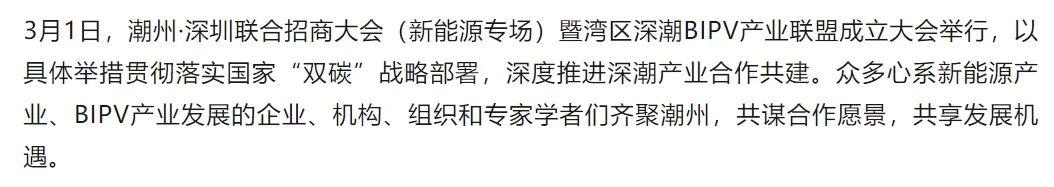 据潮州日报报道,3月1日,潮州·深圳联合招商大会(新能源专场)暨湾区深潮BIPV产业联盟成立大会举行。潮州市委书记何晓军,深圳市政府副秘书长、一级巡视员邝兵,潮州市委副书记、市长刘胜出席大会并为湾区深潮BIPV产业联盟成立揭牌。