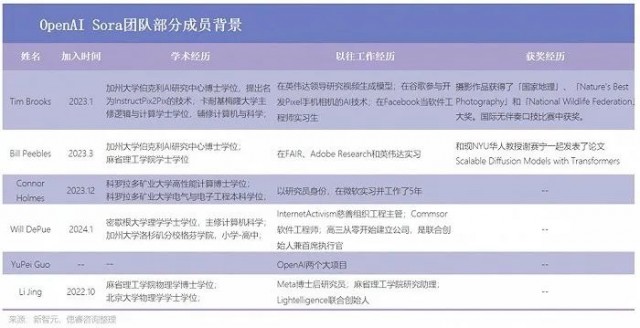 Sora就是一个例子,它背后的团队包括两名研发负责人Tim Brooks和Bill Peebles,系统负责人Connor Holmes,以及12名核心成员,博士带队,00后参与,成立还不到一年。