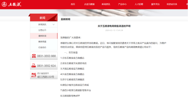 而就在3月15日当天,五粮液在官网上公布了其电商渠道名单。