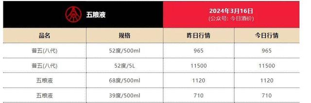 此外,记者注意到在拼多多平台上,52度500ml的第八代普五售价单瓶多在800-900元,而据今日酒价微信号,3月16日该产品批价为965元。