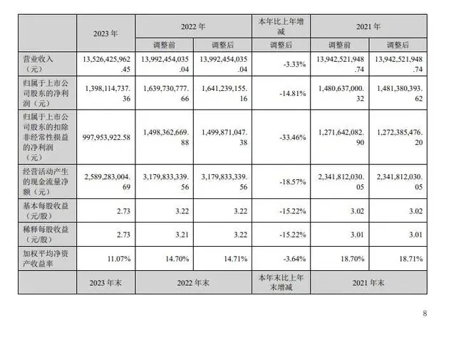3月14日晚,深南电路发布2023年报称,2023年营业收入为135.26亿元,同比下降3.33%;净利润为13.98亿元,同比下降14.81%,基本每股收益为2.73元/股;拟每10股派发现金红利9元(含税)。