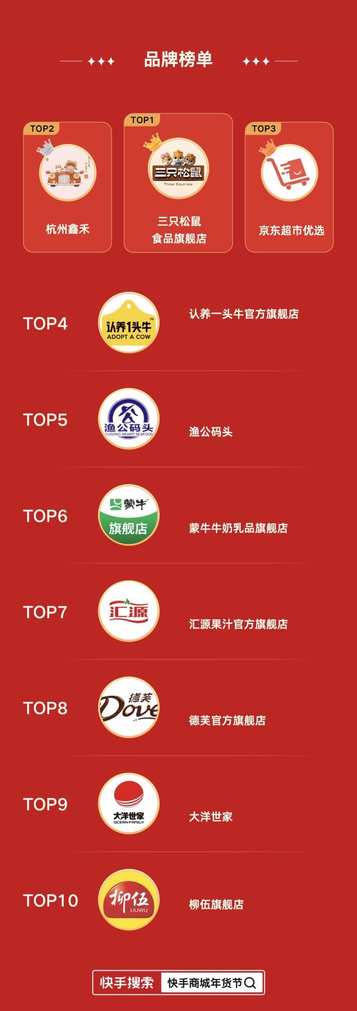 凭借良好的口碑与品质,众多生鲜食品品牌广受消费者好评。在品牌TOP10榜单上,三只松鼠(17.400, 0.13, 0.75%)食品旗舰店拔得头筹,杭州鑫禾、京东超市优选紧随其后。认养一头牛官方旗舰店、渔公码头、蒙牛牛奶乳品旗舰店、汇源果汁官方旗舰店、德芙官方旗舰店、大洋世家、柳伍旗舰店也名列榜上。