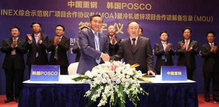4月6日,重钢与韩国浦项正式签署合资协议,在重庆设立合资公司,投资建设高强冷轧板材、高端镀锌板材项目。市委常委、常务副市长翁杰明,韩国浦项副社长张仁和在签约时致辞。