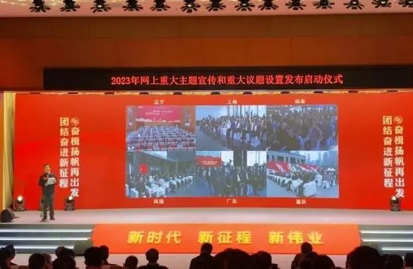 由中央网信办主办的“团结奋进新征程 奋楫扬帆再出发”2023年网上重大主题宣传和重大议题设置发布启动仪式2月17日顺利举行。仪式采取云连线方式,在北京设主会场,辽宁、上海、山东、河南、广东、重庆六地设分会场,线上线下同频共振,东西南北奋进共情。